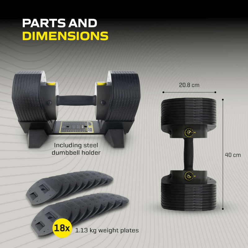 MX55 Adjustable Dumbbell Set 4.5kg – 25kg + Rack